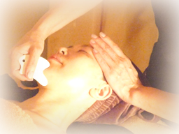 カッサプレートを使い、コリや滞りのある部位をほぐします。少しイタ気持ちいい感覚です。